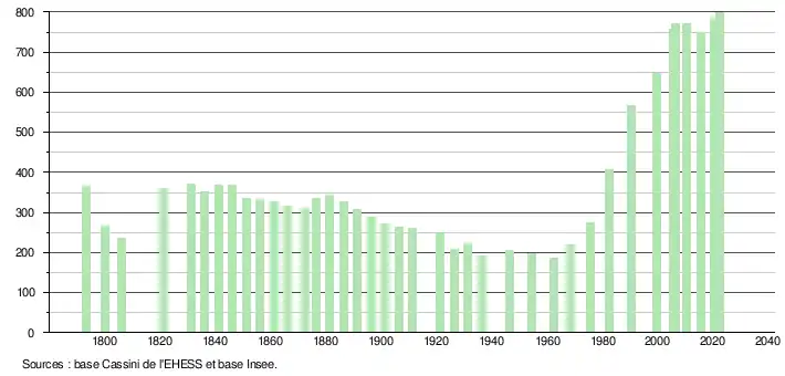 L'évolution du nombre d'habitants est connue à travers les recensements de la population effectués dans la commune depuis 1793. Pour les communes de moins de 10 000 habitants, une enquête de recensement portant sur toute la population est réalisée tous les cinq ans, les populations de référence des années intermédiaires étant quant à elles estimées par interpolation ou extrapolation[20]. Pour la commune, le premier recensement exhaustif entrant dans le cadre du nouveau dispositif a été réalisé en 2005[21].