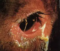 La peste bovine touche les artiodactyles, notamment les bovins et les buffles[9], mais elle peut aussi toucher des bovins et des caprins, les yacks, les zébus, les élans, les koudous, les gnous, des antilopes et les girafes ainsi que les phacochères et les potamochères[9]. Elle n'est pas transmissible à l'être humain[9]. Selon les souches de peste bovine, la mortalité varie de 30 à 80 %[10]. Les animaux qui y survivent acquièrent une immunité longue à la maladie[9].