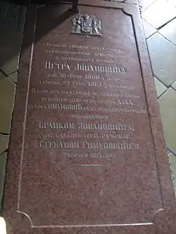 - ↑ (sr) « 500 godina manastira Krušedol »(Archive.org • Wikiwix • Archive.is • Google • Que faire ?), sur spc.rs, Site de l'Église orthodoxe serbe, (consulté le ) - « Током 18. и 19. века у манастирском храму се непрекидно похрањују земни остаци знаменитих Срба и националних хероја: грофа Ћорђа Бранковића, Арсенија Четвртог Јовановића Шакабенте, Мојсија Петровића, Јована Георгијевића, Никанора Мелентијевића, оберкапетана Атанасија Рашковића, војводе Стевана Шупљикца, кнегиње Љубице, жене кнеза Милоша Обреновића, београдског митрополита Петра и краља Милана Обреновића. ».