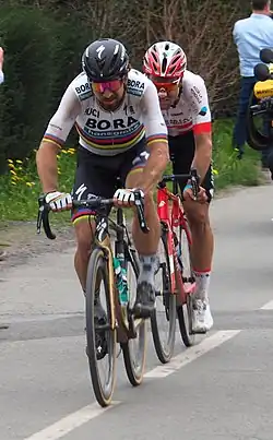 En août, il tombe malade et abandonne à un peu moins de 100 km de l'arrivée lors des championnats d'Europe[136] puis il termine dixième de l'EuroEyes Cyclassics[137]. Il dispute ensuite le Tour d'Espagne où il cumule les places d'honneur : 4 fois 2e, 2 fois 3e sans remporter de victoires d'étapes et terminant deuxième au classement par points derrière Alejandro Valverde. C'est la première fois depuis le Tour de France 2015 qu'il ne gagne pas d'étape sur un grand tour auquel il participe[138]. À la sortie de ce grand tour, il perd la tête du classement UCI World Tour au profit de Simon Yates. Lors des championnats du monde à Innsbruck, alors qu'il est le triple tenant du titre, il abandonne à plus de 70 km de l'arrivée à cause du parcours destiné aux grimpeurs[139]. C'est lui qui remet la médaille à son successeur Alejandro Valverde. Sa saison se conclut avec 8 victoires dont Paris-Roubaix, Gand-Wevelgem et 3 étapes du Tour de France.