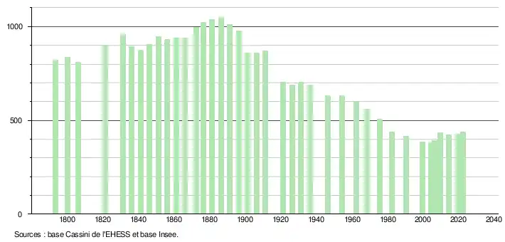 L'évolution du nombre d'habitants est connue à travers les recensements de la population effectués dans la commune depuis 1793. Pour les communes de moins de 10 000 habitants, une enquête de recensement portant sur toute la population est réalisée tous les cinq ans, les populations de référence des années intermédiaires étant quant à elles estimées par interpolation ou extrapolation[30]. Pour la commune, le premier recensement exhaustif entrant dans le cadre du nouveau dispositif a été réalisé en 2004[31].