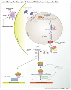 Une fois que le vecteur a été intégré dans le génome de l'hôte, le shRNA est transcrit dans le noyau par la polymérase II ou III selon le promoteur utilisé. Le produit obtenu imite un pré-microARN et est pris en charge par la protéine Drosha (en). Le shRNA en résultant est exporté du noyau par l'exportine 5. Ce produit est ensuite pris en charge par Dicer et chargé dans le complexe RISC (RNA-induced silencing complex). Le brin sens (brin passager) est dégradé. Le brin anti-sens (brin guide) dirige le complexe RISC vers les ARNm possédant une séquence complémentaire. Dans le cas d'une complémentarité parfaite, RISC clive l'ARNm. Dans le cas d'un appariement incomplet, RISC réprime seulement la traduction de l'ARNm. Dans les deux cas le shRNA entraîne l'extinction du gène ciblé.