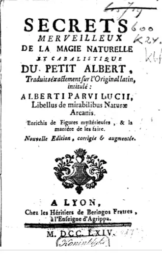 - Secrets merveilleux de la magie naturelle et cabalistique du petit Albert. Nouv. éd., cor. & augm.Lyon, Héritiers de Beringos fratres, 1782.