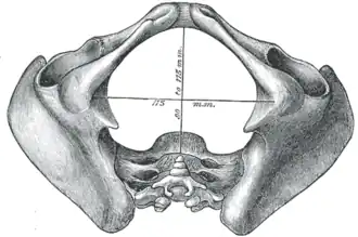 - le détroit supérieur (Apertura Pelvis superior) formé d'avant en arrière, du bord supérieur de la symphyse pubienne, la crête pectinéale, la ligne arquée et le promontoire du sacrum. Il forme, dans un plan fortement oblique en bas et en avant, une figure en forme de cœur chez 50 % des femmes, une forme ovoïde chez 25 % des femmes et une forme triangulaire chez 25 % des femmes et chez la majorité des hommes. La forme la plus favorable à l'accouchement est la forme "cartageux" (en forme de cœur), la moins favorable étant la triangulaire ;