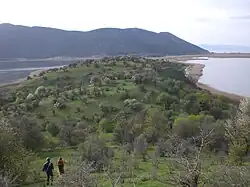 Le petit lac Prespa avec les îles de Vidronisi (à gauche) et d'Ágios Achíllios (à droite). | |