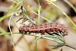 Le cycle larvaire est très court[2]. La chenille possède une tête marron tachée de noir et un corps noir tacheté de blanc et de marron orné d'une paire de lignes dorsales blanches et d'un scoli marron[3].