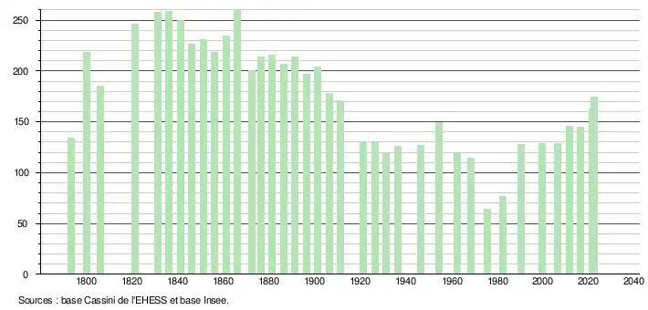 L'évolution du nombre d'habitants est connue à travers les recensements de la population effectués dans la commune depuis 1793. Pour les communes de moins de 10 000 habitants, une enquête de recensement portant sur toute la population est réalisée tous les cinq ans, les populations de référence des années intermédiaires étant quant à elles estimées par interpolation ou extrapolation[16]. Pour la commune, le premier recensement exhaustif entrant dans le cadre du nouveau dispositif a été réalisé en 2006[17].