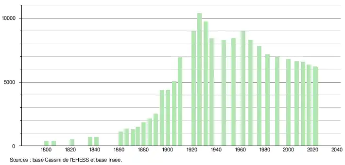 L'évolution du nombre d'habitants est connue à travers les recensements de la population effectués dans la commune depuis 1800. Pour les communes de moins de 10 000 habitants, une enquête de recensement portant sur toute la population est réalisée tous les cinq ans, les populations de référence des années intermédiaires étant quant à elles estimées par interpolation ou extrapolation[25]. Pour la commune, le premier recensement exhaustif entrant dans le cadre du nouveau dispositif a été réalisé en 2006[26].