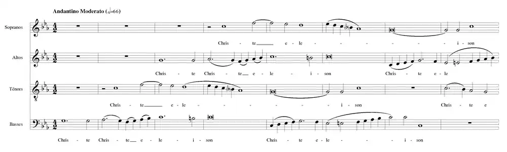 La partie centrale est un double canon sotto voce dans un style archaïsant sur le texte du Christe eleison. Sa dynamique contraste avec la première partie[2].