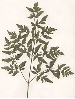 Les folioles sont glauques en dessous, triangulaires, raides, étalées et dentées. Les segments foliaires ultimes sont bordés de courtes dents spineuses[14].