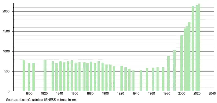 L'évolution du nombre d'habitants est connue à travers les recensements de la population effectués dans la commune depuis 1793. Pour les communes de moins de 10 000 habitants, une enquête de recensement portant sur toute la population est réalisée tous les cinq ans, les populations de référence des années intermédiaires étant quant à elles estimées par interpolation ou extrapolation[25]. Pour la commune, le premier recensement exhaustif entrant dans le cadre du nouveau dispositif a été réalisé en 2004[26].