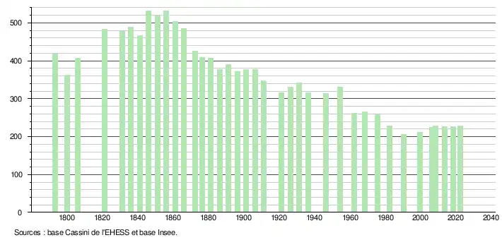 L'évolution du nombre d'habitants est connue à travers les recensements de la population effectués dans la commune depuis 1793. Pour les communes de moins de 10 000 habitants, une enquête de recensement portant sur toute la population est réalisée tous les cinq ans, les populations de référence des années intermédiaires étant quant à elles estimées par interpolation ou extrapolation[19]. Pour la commune, le premier recensement exhaustif entrant dans le cadre du nouveau dispositif a été réalisé en 2008[20].