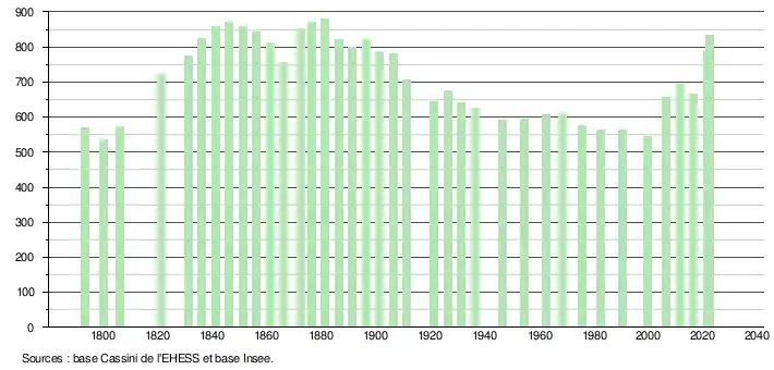 | L'évolution du nombre d'habitants est connue à travers les recensements de la population effectués dans la commune depuis 1793. Pour les communes de moins de 10 000 habitants, une enquête de recensement portant sur toute la population est réalisée tous les cinq ans, les populations de référence des années intermédiaires étant quant à elles estimées par interpolation ou extrapolation[22]. Pour la commune, le premier recensement exhaustif entrant dans le cadre du nouveau dispositif a été réalisé en 2006[23]. En 2022, la commune comptait 832 habitants[Note 2], en évolution de +24,92 % par rapport à 2016 (Landes : +5,78 %, France hors Mayotte : +2,11 %). |
