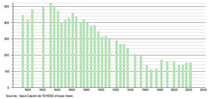 L'évolution du nombre d'habitants est connue à travers les recensements de la population effectués dans la commune depuis 1793. Pour les communes de moins de 10 000 habitants, une enquête de recensement portant sur toute la population est réalisée tous les cinq ans, les populations de référence des années intermédiaires étant quant à elles estimées par interpolation ou extrapolation[19]. Pour la commune, le premier recensement exhaustif entrant dans le cadre du nouveau dispositif a été réalisé en 2006[20].