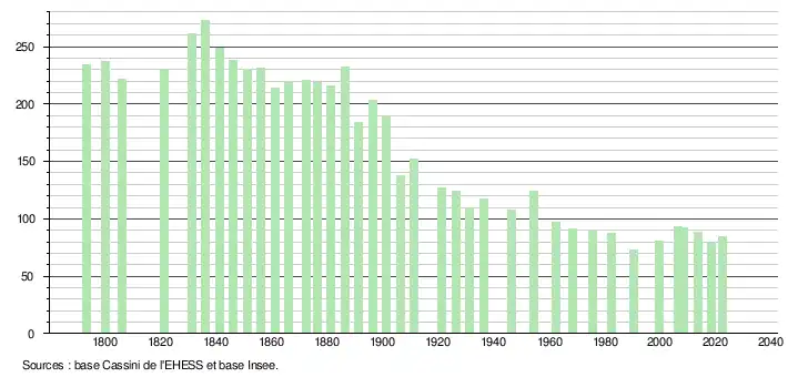 - ↑ Population municipale de référence en vigueur au 1er janvier 2025, millésimée 2022, définie dans les limites territoriales en vigueur au 1er janvier 2024, date de référence statistique : 1er janvier 2022.