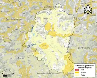 Le retrait-gonflement des sols argileux est susceptible d'engendrer des dommages importants aux bâtiments en cas d’alternance de périodes de sécheresse et de pluie. 15,2 % de la superficie communale est en aléa moyen ou fort (26,8 % au niveau départemental et 48,5 % au niveau national). Sur les 520 bâtiments dénombrés sur la commune en 2019, dix sont en aléa moyen ou fort, soit 2 %, à comparer aux 36 % au niveau départemental et 54 % au niveau national. Une cartographie de l'exposition du territoire national au retrait gonflement des sols argileux est disponible sur le site du BRGM[15],[Carte 2].