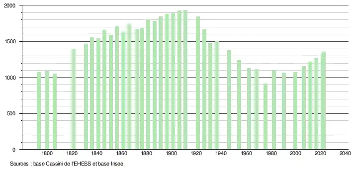 L'évolution du nombre d'habitants est connue à travers les recensements de la population effectués dans la commune depuis 1793. Pour les communes de moins de 10 000 habitants, une enquête de recensement portant sur toute la population est réalisée tous les cinq ans, les populations de référence des années intermédiaires étant quant à elles estimées par interpolation ou extrapolation[26]. Pour la commune, le premier recensement exhaustif entrant dans le cadre du nouveau dispositif a été réalisé en 2006[27].