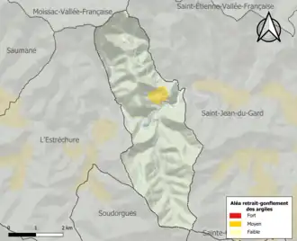 La commune est vulnérable au risque de mouvements de terrains constitué principalement du retrait-gonflement des sols argileux[24]. Cet aléa est susceptible d'engendrer des dommages importants aux bâtiments en cas d’alternance de périodes de sécheresse et de pluie. 2 % de la superficie communale est en aléa moyen ou fort (67,5 % au niveau départemental et 48,5 % au niveau national). Sur les 34 bâtiments dénombrés sur la commune en 2019, 11 sont en aléa moyen ou fort, soit 32 %, à comparer aux 90 % au niveau départemental et 54 % au niveau national. Une cartographie de l'exposition du territoire national au retrait gonflement des sols argileux est disponible sur le site du BRGM[25],[Carte 2].