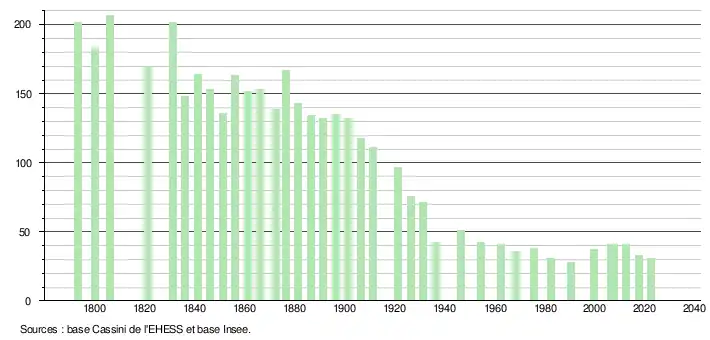 L'évolution du nombre d'habitants est connue à travers les recensements de la population effectués dans la commune depuis 1793. Pour les communes de moins de 10 000 habitants, une enquête de recensement portant sur toute la population est réalisée tous les cinq ans, les populations de référence des années intermédiaires étant quant à elles estimées par interpolation ou extrapolation[30]. Pour la commune, le premier recensement exhaustif entrant dans le cadre du nouveau dispositif a été réalisé en 2007[31].