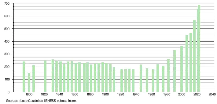 - ↑ Population municipale de référence en vigueur au 1er janvier 2025, millésimée 2022, définie dans les limites territoriales en vigueur au 1er janvier 2024, date de référence statistique : 1er janvier 2022.
