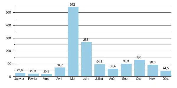Le débit moyen mensuel observé en mars (minimum d'étiage) atteint 20,3 m3/s, soit moins de 4 % du débit moyen du mois de juin (542 m3/s), ce qui souligne l'amplitude élevée des variations saisonnières. Sur la période d'observation de 60 ans, le débit mensuel minimal a été de 10,4 m3/s en , tandis que le débit mensuel maximal s'est élevé à 1 060 m3/s en .