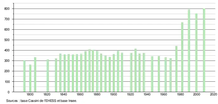 - ↑ Par convention dans Wikipédia, le principe a été retenu de n’afficher dans le tableau des recensements et le graphique, pour les populations légales postérieures à 1999, que les populations correspondant à une enquête exhaustive de recensement pour les communes de moins de 10 000 habitants, et que les populations des années 2006, 2011, 2016, etc. pour les communes de plus de 10 000 habitants, ainsi que la dernière population légale publiée par l’Insee pour l'ensemble des communes.