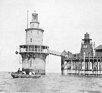La construction du phare de Maplin Sands (en) en 1838 a attiré l'attention des concepteurs de phares américains, qui ont vu la technologie de pieux vissés qu'elle a introduite comme un moyen à la fois d'économie de construction et de simplification de la mise en place de fondations dans des fonds mous. Le major Hartman Bache, qui avait conçu le plan de la jetée en pierre annulée, a été chargé d'essayer la nouvelle technique, et aidé par le lieutenant George Meade, a d'abord construit une structure en fer conique reposant sur neuf piles. Cette structure a été allumée pour la première fois en 1850. Il est devenu évident qu'elle n'était pas suffisante pour résister à la glace en mouvement, et d'autres piles ont été coulées dans une sorte de clôture autour de la lumière. Au cours des huit années suivantes, soixante-huit autres piles ont été placées autour de la lumière et une plate-forme en bois a été posée en travers. Le phare proprement dit s'élevait au centre de la plate-forme comme une courte tour.