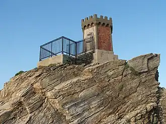 La porte d'accès à la tour est précédée d'un escalier qui s'adapte au rocher en contrebas.