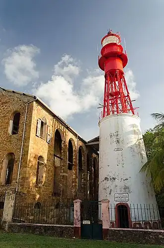 L'île Royale fut un centre administratif pour les prisons françaises. Un phare fut construit sur une colline au centre de l'île dans un des quartiers disciplinaires du bagne. L'édifice fait 29 m de haut. Sa base est une tour ronde en brique supportant un échafaudage dont le sommet contient une salle, une galerie et la lanterne. La date de 1914, à peine visible, est inscrite sur la partie supérieure de la tour de briques.