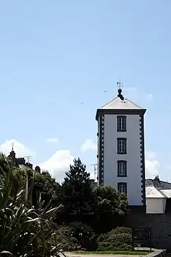 C'est une tour carrée de 3 niveaux accolée à un bâtiment formant terrasse d'un niveau pour le stockage des matériels.