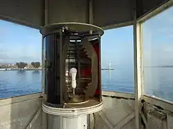 La portée lumineuse est par temps clair de 36 kilomètres pour l'éclat blanc et de 24 kilomètres pour le vert. Par ces colorations, le feu se met en conformité avec la législation internationale de réglant la navigation sur les lacs. La période de rotation est de 12 secondes pour un tour de l'appareil, les panneaux lenticulaires blancs et verts alternant toutes les 3 secondes. Le socle comporte un bac de mercure qui assure un mouvement rotatif « sans frictions ». L’énergie lumineuse est assurée par un bec Auer (manchons) alimenté au gaz. La puissance est de 270 carcels (75 bougies) dans la couleur blanche et réduite à 38 dans la verte. L’appareil d'entraînement se présente sous une forme analogue à celui d’une horloge. Il est constitué d'engrenages d'acier et de laiton, d'un enrouleur entraîné par des contrepoids qui glissent par l'intermédiaire de poulies dans la colonne du phare. Ce système assure une autonomie de près de 72 heures avant l'intervention du gardien pour remonter les charges[9].