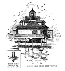 Les phares sur pilotis étant relativement peu coûteux, faciles et rapides à construire, ils deviennent particulièrement populaires après la guerre de Sécession lorsque le Lighthouse Board décide de remplacer les bateaux-phares par des phares sur pilotis. La plupart des phares sur pilotis sont fabriqués avec des pieux en fer, bien que quelques-uns aient été fabriqués avec des pieux en bois recouverts de manchons en métal. Le phare sur pilotis typique est hexagonal ou octogonal et consiste en un pieux central qui est d'abord mis en place, puis six ou huit pieux périphériques vissés autour de lui.