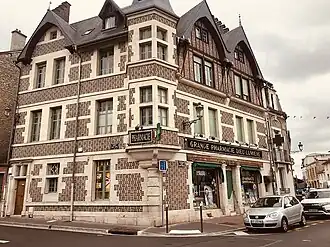 Le bâtiment est construit dans un style historiciste (dit aussi style « pastiche »). Il rappelle l’architecture médiévale avec façades à pignons ardoisés, colombages et tourelles. Des animaux sont disposés à chaque gouttière (serpent, escargot et tortue)[2].