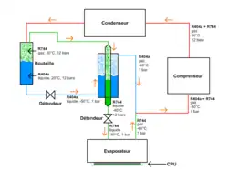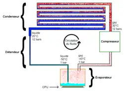 Les deux fluides pénètrent dans un échangeur : le R404A fait condenser le R744 et lui-même se vaporise. Le R744, après avoir vu sa pression tomber à 1 bar grâce à un détendeur, rentre dans l'évaporateur à une température de −80 °C dans sa phase liquide, refroidit le microprocesseur et ressort à une température de −60 °C sous sa forme gazeuse. Les deux gaz se rejoignent alors et retournent au compresseur afin de recommencer un cycle.