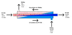 À la sortie du compresseur, le R404A sera toujours sous forme gazeuse, mais aura une pression de 12 bar pour une température de 30 °C (la température est proportionnelle à la pression quand elle est exprimée en kelvin). Le gaz, durant son passage dans le condenseur, va être refroidi par l'air ambiant, et va ainsi se liquéfier (sa température va être inférieure à unModèle:Ité pour une pression de 12 bar). À la sortie du condenseur, le R404A sera dans sa phase liquide, à une température de 20 °C et une pression de 12 bar. Il va ensuite pénétrer dans le détendeur (souvent un tuyau capillaire), qui va faire diminuer sa pression à 1 bar, et donc sa température à −50 °C. Le R404A va finalement revenir dans l'évaporateur et recommencer un cycle.