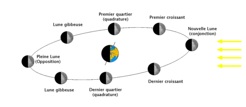 Le côté éclairé de la Lune indique la direction du Soleil. Pour un observateur terrien, la Lune se « déplace » moins rapidement dans le ciel que le Soleil. À partir de la nouvelle lune, elle prend environ 50 minutes de retard à chaque jour (les 24 heures d'un jour divisées par les 29,53 jours de lunaison). Lors des premières phases, elle suit le Soleil et se couche peu de temps après ce dernier. Au fur et à mesure que les jours passent, la Lune se lève de plus en plus tard. Environ deux semaines après la nouvelle lune, elle est à l'opposé du Soleil et elle est pleine. Une semaine plus tard, la Lune est « rattrapée » par le Soleil. À partir du dernier quartier, elle se lève de plus en plus tôt le matin, pour finalement se lever en même temps que le Soleil lors de la nouvelle lune suivante.