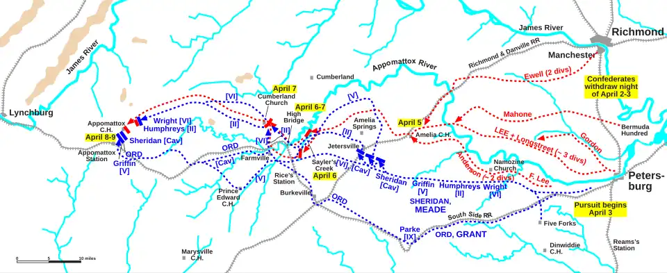 L'attaque de Sheridan, parfaitement exécutée, lors de la bataille de Sayler's Creek, le , scelle le destin de l'armée de Lee, par la capture de plus de 20 % du reste de ses troupes[36]. Le président Lincoln envoie à Grant un télégramme le :