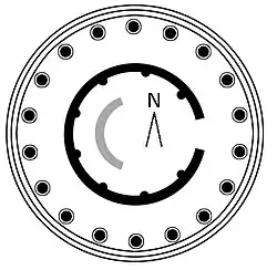 Sur son bord extérieur, la première marche, dont les pierres portent toutes un E comme marque du tailleur de pierre, a un rayon de 7,62 m. Au niveau du stylobate, les 18 colonnes s'élevaient à une distance radiale au centre du bâtiment de 6,38 m.