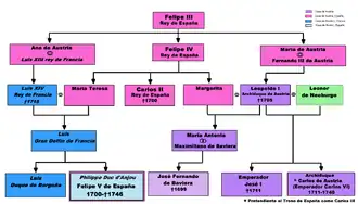 Il est notable qu'en 1713, Philippe V avait instauré, par la Pragmatique Sanction, la loi salique en Espagne[17], contrairement à la tradition espagnole qui permettait qu'une fille de roi devienne reine — comme le fut d'ailleurs Isabelle la Catholique, reine de Castille et León de 1474 à 1504. La révocation de ce décret par Ferdinand VII, bien plus tard au XIXe siècle, fut responsable des trois guerres civiles carlistes entre les isabellistes (puis alphonsistes), partisans d'Isabelle II (puis de son fils Alphonse XII) et les carlistes, partisans de son oncle l'infant Charles (puis de ses descendants), de 1833 à 1840, 1846 à 1849 et 1872 à 1876.