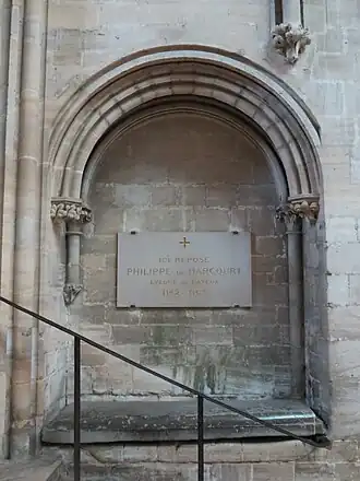 Tableau de Philippe d'Harcourt tenant une maquette de la cathédrale. | ||||||||