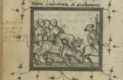 La mort accidentelle de Philippe de France représentée dans une enluminure ornant un manuscrit des Grandes Chroniques de France, vers 1332-1350, British Library. | |
