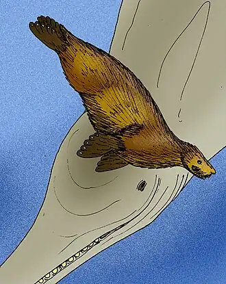 Dessin schématique d'Enaliarctos emlongi (premier plan) et du cétacé Macrodelphinus.