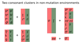 En contexte de mutation consonantique initiale, il existe une gamme beaucoup plus large de groupes consonantiques possibles en début de mot[53] ; par exemple, en contexte de lénition, on retrouve les mots suivants : bhlas /wl̪ˠasˠ/ « goûta », bhris /vʲɾʲɪʃ/ « cassa », chleacht /çlʲaxt̪ˠ/ « exerça », chrom /xɾˠɔmˠ/ « courba », ghreamaigh /ˈjɾʲamˠə/ « colla », ghníomhaigh /ˈjnʲiːwə/ « agit », shleamhnaigh /hlʲəun̪ˠə/ « glissa », shnámh /hn̪ˠaːw/ « nagea », shroich /hɾˠɪç/ « atteignit ». En contexte d'éclipse, on retrouve : mbláth /mˠl̪ˠaː/ « fleur », mbliana /ˈmʲlʲiən̪ˠə/ « ans », mbrisfeá /ˈmʲɾʲɪʃaː/ « tu casserais », ndlúth /n̪ˠl̪ˠuː/ « déformer », ndroichead /ˈn̪ˠɾˠɔhəd̪ˠ/ « pont », ndréimire /ˈnʲɾʲeːmʲəɾʲə/ « échelle », ngléasfá /ˈɲlʲeːsˠaː/ « tu habillerais », ngreadfá /ˈɲɾʲat̪ˠaː/ « tu partirais », ngníomhófá /ˈɲnʲiːwoːhaː/ « tu agirais ».