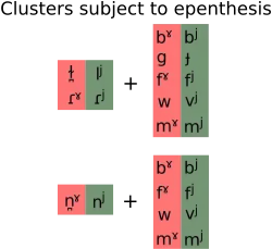 Un groupe formé de /ɾˠ, ɾʲ/, /l̪ˠ, lʲ/ ou /n̪ˠ, nʲ/ suivi d'une consonne labiale ou dorsale (sauf les occlusives sourdes /pˠ, pʲ/, /k, c/) est dissocié par une voyelle épenthétique /ə/[56] : borb /ˈbˠɔɾˠəbˠ/ « brusque », gorm /ˈɡɔɾˠəmˠ/ « bleu », dearmad /ˈdʲaɾˠəmˠəd̪ˠ/ « faute », dearfa /ˈdʲaɾˠəfˠə/ « certain », seirbhís /ˈʃɛɾʲəvʲiːʃ/ « service », fearg /ˈfʲaɾˠəɡ/ « colère », dorcha /ˈd̪ˠɔɾˠəxə/ « sombre », dalba /ˈd̪ˠal̪ˠəbˠə/ « audacieux », colm /ˈkɔl̪ˠəmˠ/ « colombe », soilbhir /ˈsˠɪlʲəvʲəɾʲ/ « agréable », gealbhan /ˈɟal̪ˠəwən̪ˠ/ « moineau », binb /ˈbʲɪnʲəbʲ/ « venin », Banba, /ˈbˠan̪ˠəbə/ (un nom pour l'Irlande), ainm /ˈanʲəmʲ/ « nom », meanma /ˈmʲan̪ˠəmˠə/ « esprit », ainmhí /ˈanʲəvʲiː/ « animal ».