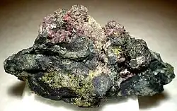 Phosphosidérite rouge parmi de la strengite violette. Largeur de l'image 4 mm. | |