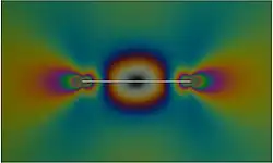 σ1 et σ2 désignent respectivement les première et deuxième principales contraintes orthogonales (σ1 en axe vertical et σ2 en axe horizontal)[75]. Motifs de franges isochromatiques visibles autour d'une plaquette d'acier insérée dans une résine époxy photo-élastique en deux parties. Le retard modifie la polarisation de la lumière transmise. Le polariscope combine les différents états de polarisation des ondes lumineuses avant et après le passage du rayon de lumière à travers l'échantillon ou corps étudié. En raison de l'interférence optique des deux ondes, un motif de franges apparaît[73],[74],[11].