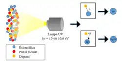 La sensibilité peut être augmentée en additionnant un dopant qui a une énergie d’ionisation plus basse que l’échantillon lui-même. La source de lumière UV utilisée doit être à décharge de krypton. Le dopant peut agir en tant qu’intermédiaire entre les photons et l’analyte par un transfert de charge ou de proton[4]. Pour travailler avec un dopant, le composé choisi doit avoir une énergie d’ionisation plus basse que celle du photon de la lumière émise pour que les photoions aient une énergie de recombinaison haute et une affinité pour les protons qui est faible[5]. Le dopant est normalement ajouté en quantité importante, c’est-à-dire entre 10 et 30 % de la phase mobile (matrice). Par contre, la sensibilité diminue de nouveau lorsque la teneur en dopants surpasse 30 %. Dans les dispositifs, la sensibilité augmente de deux à trois ordres de grandeur lorsqu’un dopant est utilisé. L’échantillon peut être ionisé selon deux mécanismes, soit par une perte d’électron par réaction d’oxydation/réduction ou bien par déprotonnation du dopant.