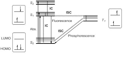 Lorsqu'une molécule dans son état fondamental (S0) absorbe de la lumière, un électron est excité jusqu'à une orbitale de plus haute énergie. Cet électron maintient son spin selon la règle de sélection pour le spin ; d'autres transitions briseraient la loi de conservation du moment cinétique. L'excitation jusqu'à un état singulet plus élevé peut exciter l'électron de l'orbitale HO à l'orbitale BV, ou bien à une orbitale supérieure. Alors des états singulets excités S1, S2, S3 à différentes énergies sont possibles.
