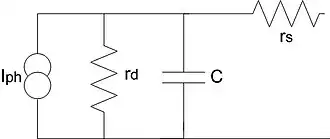 Ci-contre, le schéma électrique équivalent de la photodiode PIN, utilisé lors de l’analyse du circuit électrique dans lequel elle a été intégrée.