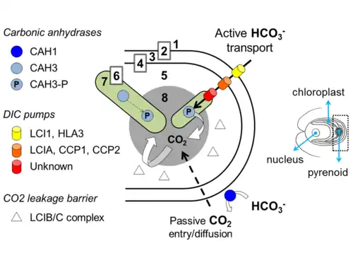 De très nombreuses algues, ainsi que les plantes terrestre de l'embranchement des anthocérotes, disposent de sous-organites (microcompartiments) appelés pyrénoïdes présents dans leurs chloroplastes pour y concentrer le dioxyde de carbone autour de leur Rubisco[23]. Le contenu (matrice) de ces pyrénoïdes est essentiellement constitué de Rubisco[24] et est souvent traversé par des thylakoïdes qui se prolongent dans le stroma du chloroplaste.